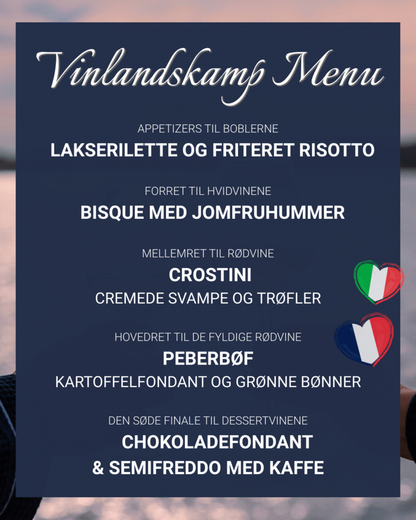 🍷 Til hver af de 4 retter serveres 2 vine blindt – én fra hvert land.